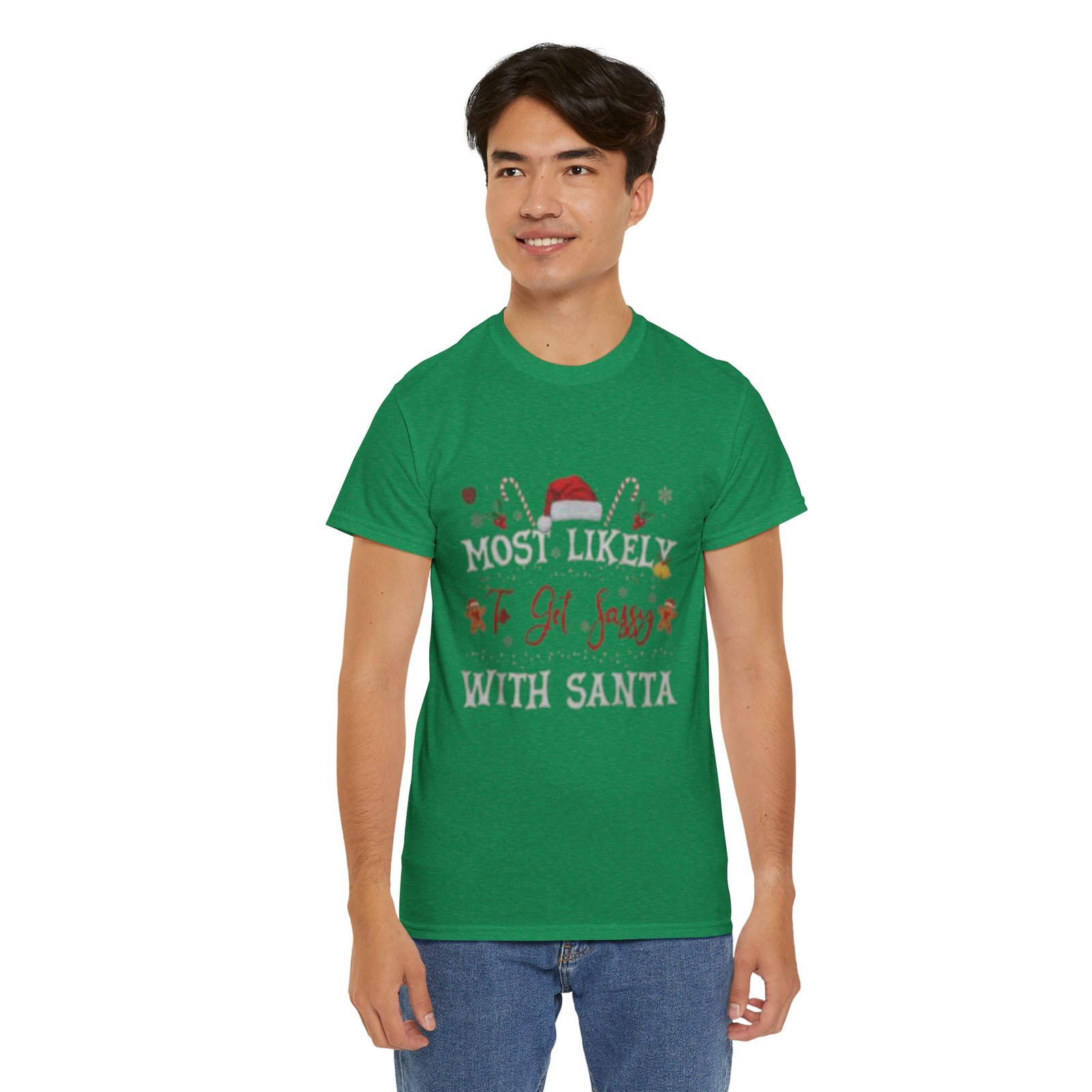 Slide into the kind of holiday vibe that makes living rooms louder and smiles wider. This sturdy cotton tee wears its festive heart on its chest with a playful, vintage-inspired Christmas print — candy canes, a Santa hat, and cheerful lettering that reads like a private joke among friends and family. The fabric feels substantial yet breathable; the classic crew neck and relaxed fit let you move easily between cookie-baking, tree-trimming, and late-night carol singalongs. The muted, slightly rustic print colors give it a homespun, cozy look that sits comfortably beside twinkling lights and hot cocoa mugs.