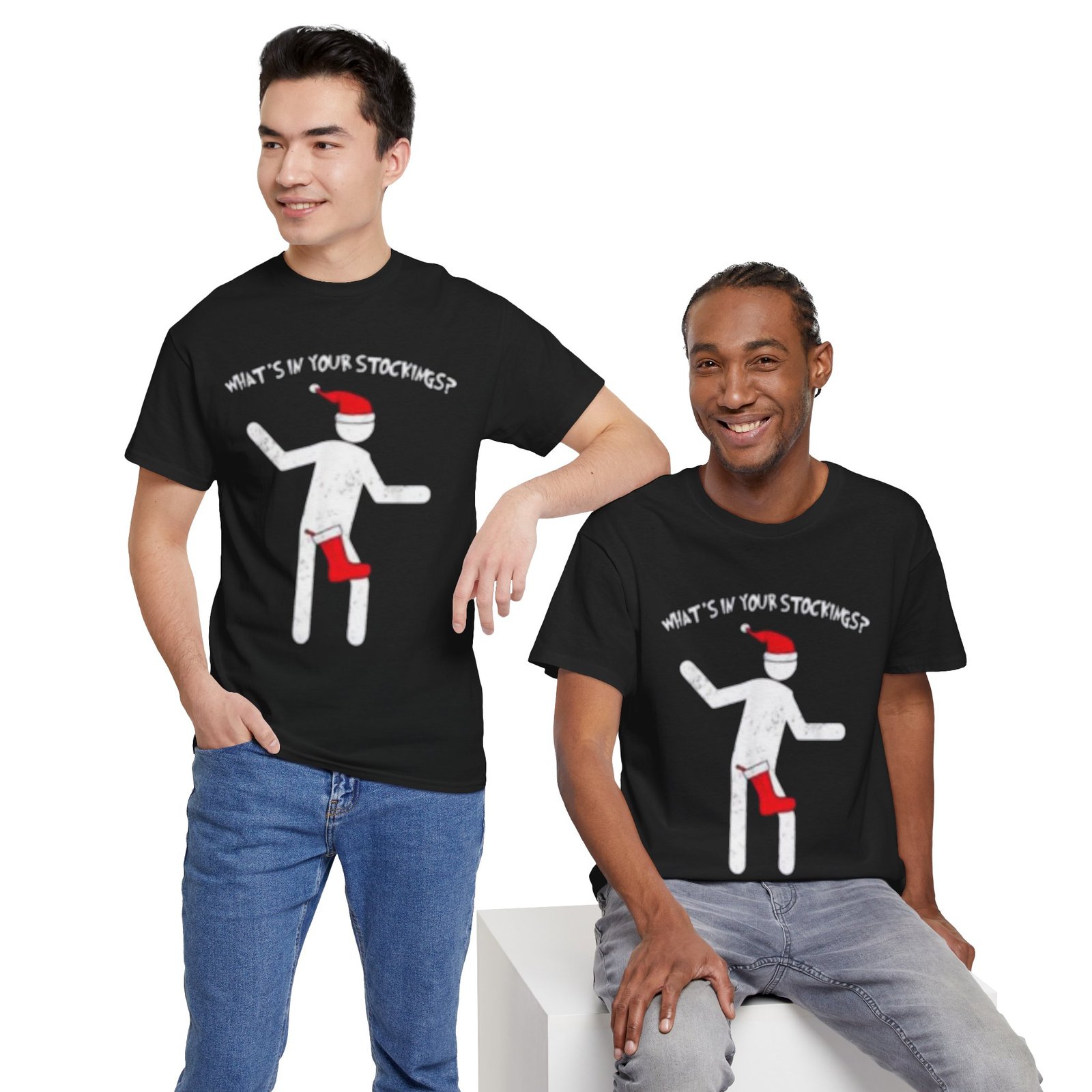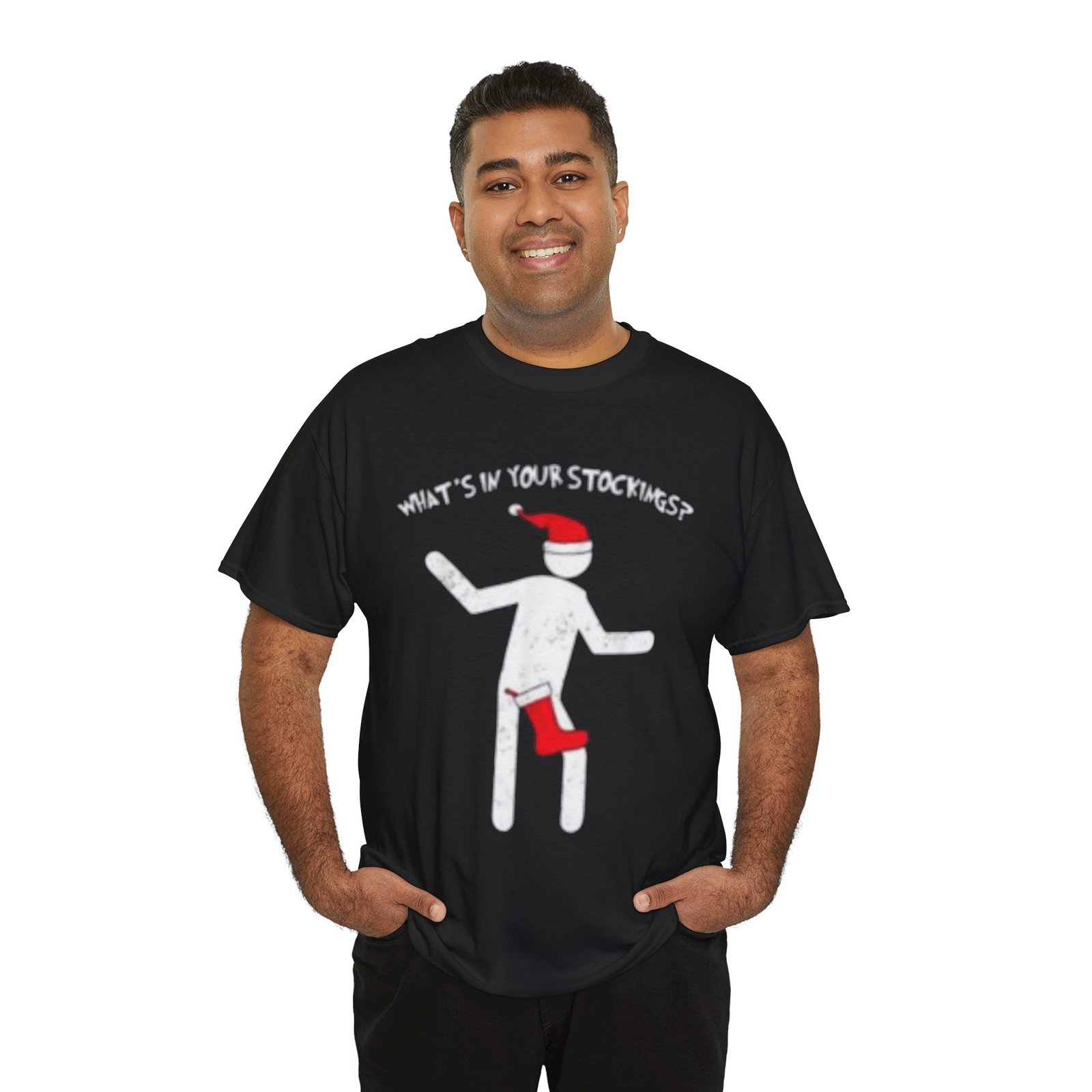 A soft, sturdy tee that carries a little mischievous holiday humor. The shirt shows a playful, stick-figure character wearing a Santa hat and peeking into a red stocking, with the cheeky line “What’s in your stockings?” above. It sits on a medium-weight cotton body that holds print details crisply and keeps its shape through washes. Wear it to low-key holiday hangs, ugly-sweater alternative nights, or while wrapping gifts and sipping cocoa — it reads like a wink to friends who appreciate smart, slightly irreverent seasonal fun.